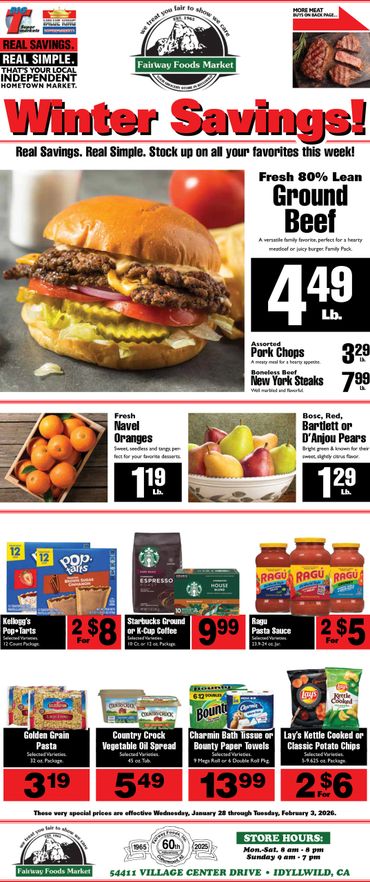 Friendly family owned grocery store in Idyllwild, California, a beautiful tree studded town located in the San Jacinto Mountains, 23 miles above Hemet in Riverside County. Best selection of fresh produce, tender beef, beer, wine, bread, hot deli, health and beauty aids, household items, and pet care products on the hill! Our friendly caring staff welcomes you to the largest grocery story in Idyllwild!