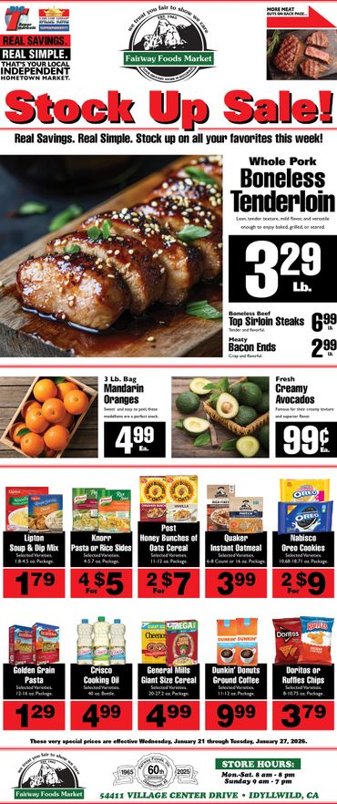 Friendly family owned grocery store in Idyllwild, California, a beautiful tree studded town located in the San Jacinto Mountains, 23 miles above Hemet in Riverside County. Best selection of fresh produce, tender beef, beer, wine, bread, hot deli, health and beauty aids, household items, and pet care products on the hill! Our friendly caring staff welcomes you to the largest grocery story in Idyllwild!